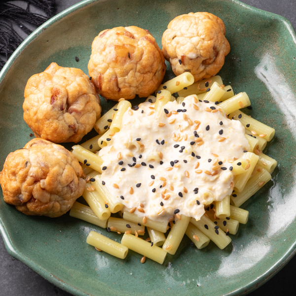 Ingredientes: Sobrecoxa, bacon, macarrão, milho, cebola, creme de leite de castanha de caju, creme de leite vegetal, óleo de soja, alho, sal, cebolinha, azeite de oliva, noz moscada, ervas finas e pimenta do reino