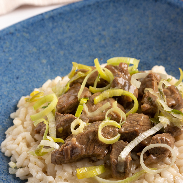 Ingredientes: Patinho bovino, arroz carnaroli, caldo de legumes, mostarda amarela, alho poró, cebola, alho, óleo de soja, amido de milho, azeite de oliva, cebolinha, sal, salsinha, alho granulado, orégano e pimenta do reino preta.