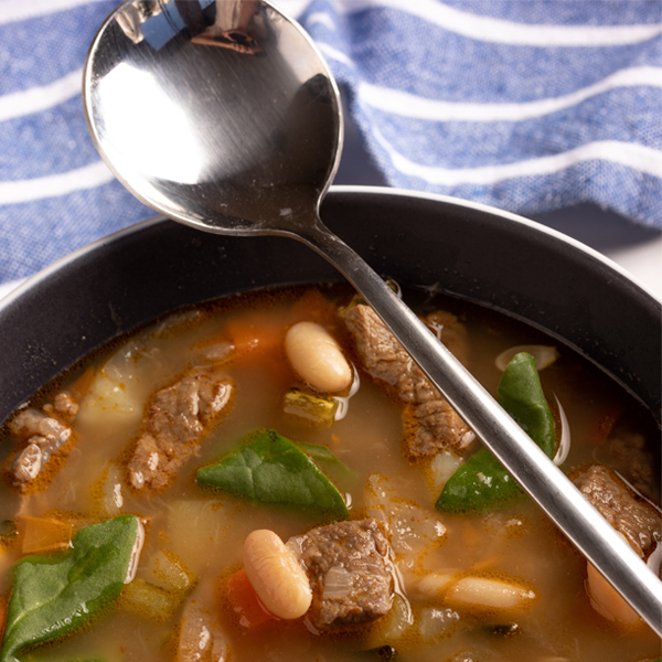 Ingredientes: Carne bovina (músculo), batata inglesa, feijão branco, abobrinha italiana, cenoura, tomate, cebola, espinafre, manjericão, sal, alho, azeite de oliva e pimenta calabresa em pó.